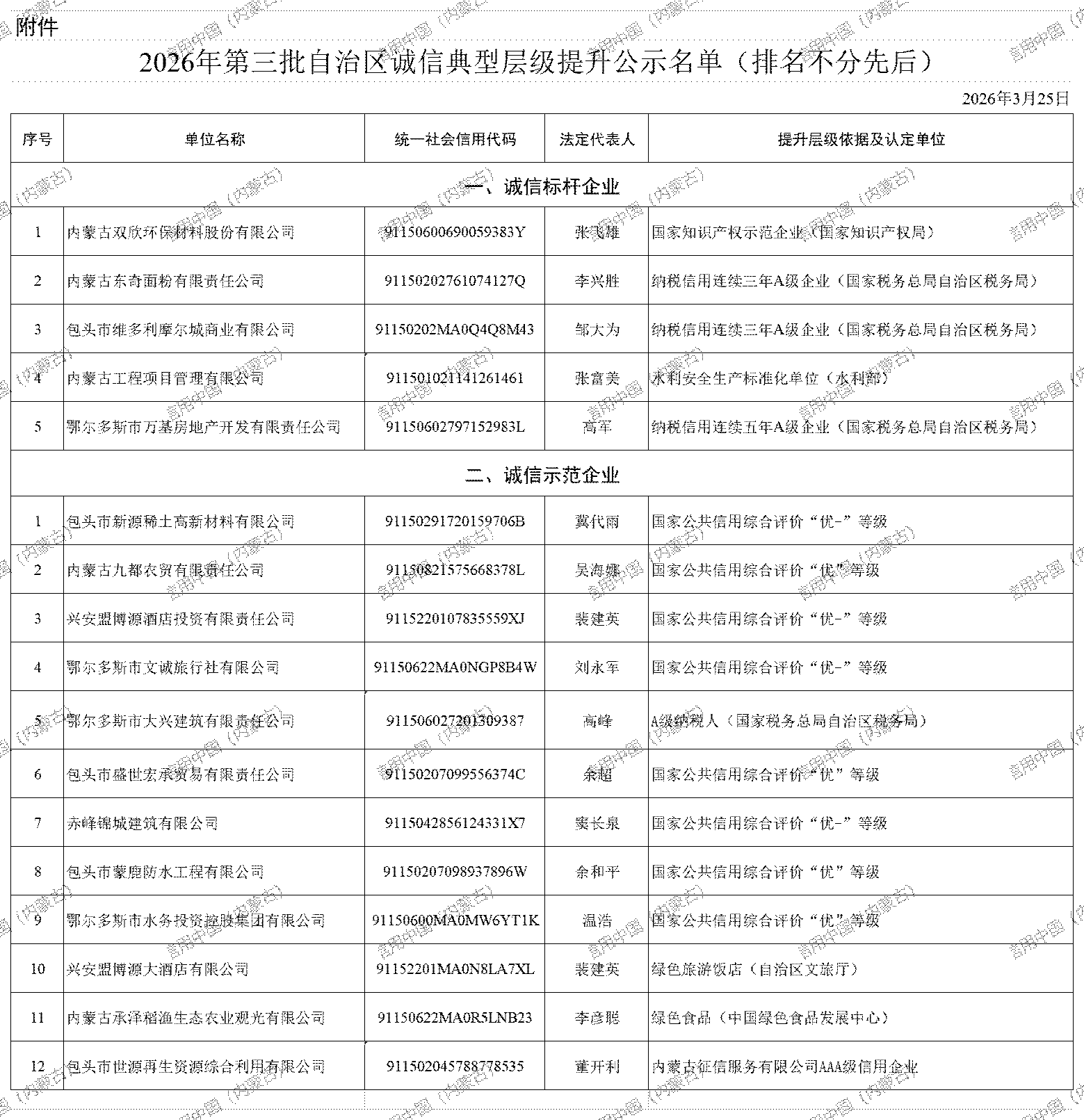 内蒙古自治区公示2026年第三批诚信典型企业名单